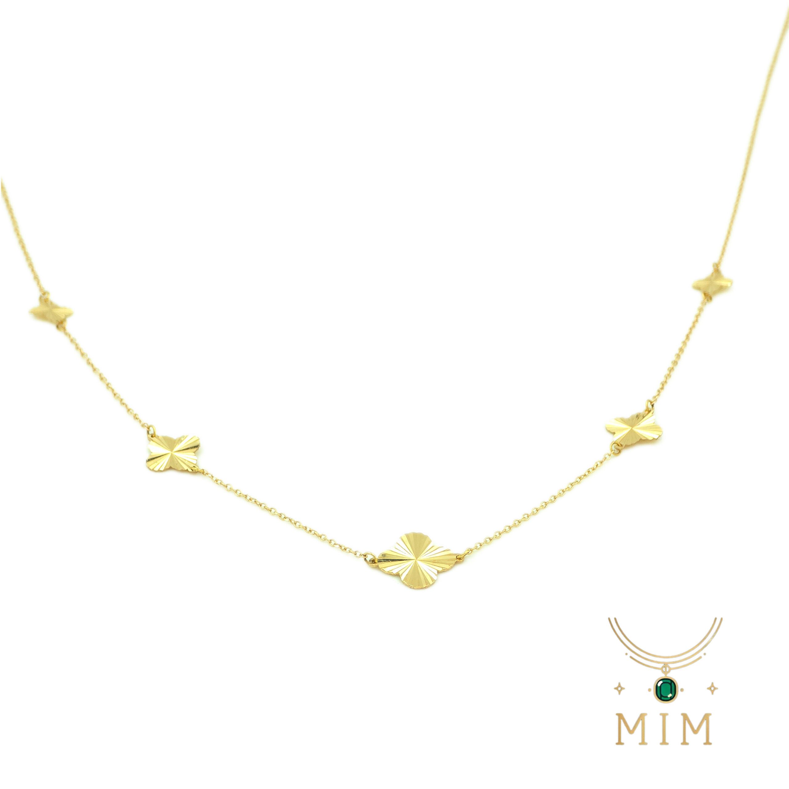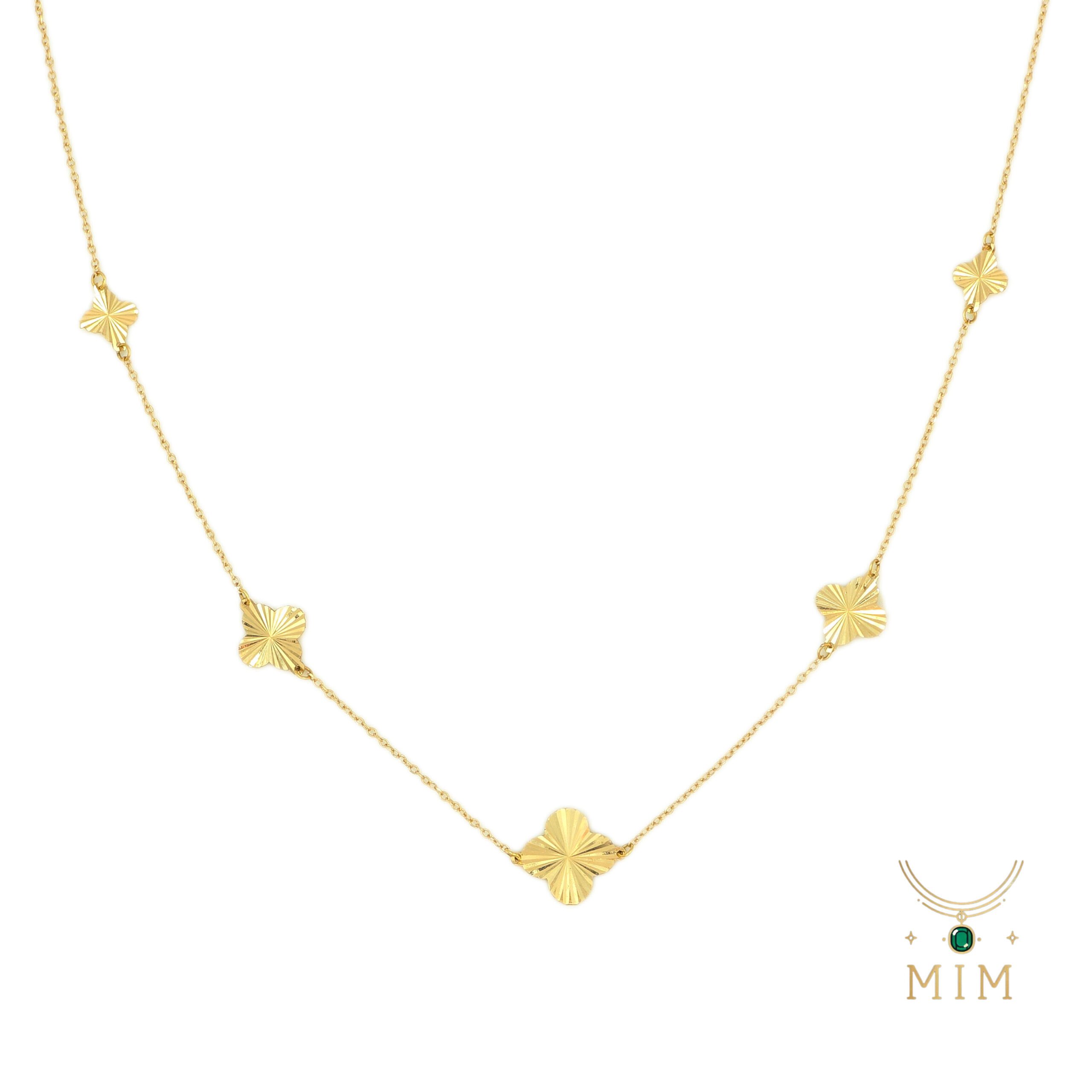 در بسیاری از مدل های گردنبند ونکلیف، این گل های نمادین به صورت تکی، دوتایی یا زنجیره ای از چند آویز متصل به هم دیده می شوند. هر یک از این گل ها با سنگ هایی نظیر Mother of Pearl (مادر مروارید)، Onyx، Carnelian، Lapis Lazuli یا Malachite ساخته می شوند. قاب طلایی دور گل ها به صورت دانه دانه و منجوق دوزی شده طراحی شده که علاوه بر درخشش بیشتر، حالتی کلاسیک و زنانه ایجاد می کند.