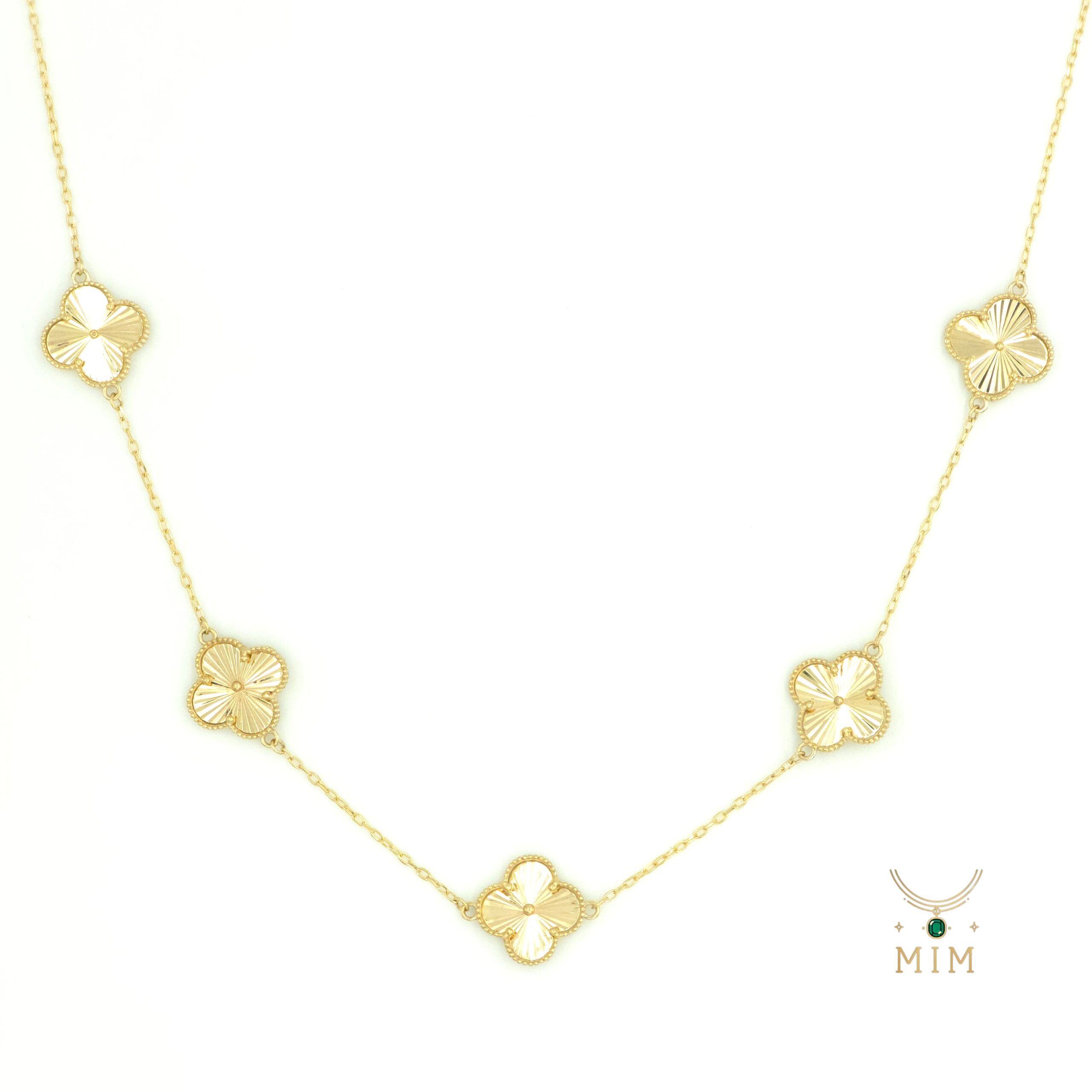 در بسیاری از مدل های گردنبند ونکلیف، این گل های نمادین به صورت تکی، دوتایی یا زنجیره ای از چند آویز متصل به هم دیده می شوند. هر یک از این گل ها با سنگ هایی نظیر Mother of Pearl (مادر مروارید)، Onyx، Carnelian، Lapis Lazuli یا Malachite ساخته می شوند. قاب طلایی دور گل ها به صورت دانه دانه و منجوق دوزی شده طراحی شده که علاوه بر درخشش بیشتر، حالتی کلاسیک و زنانه ایجاد می کند.
